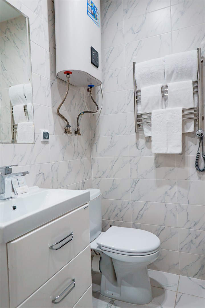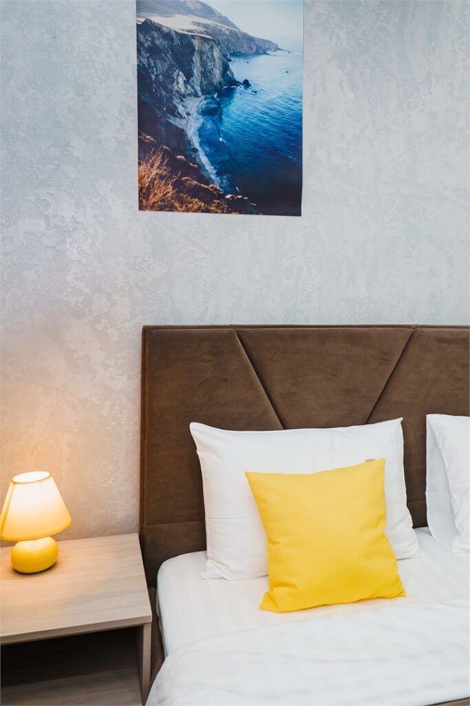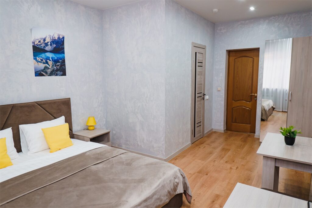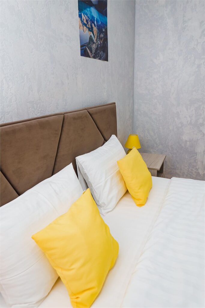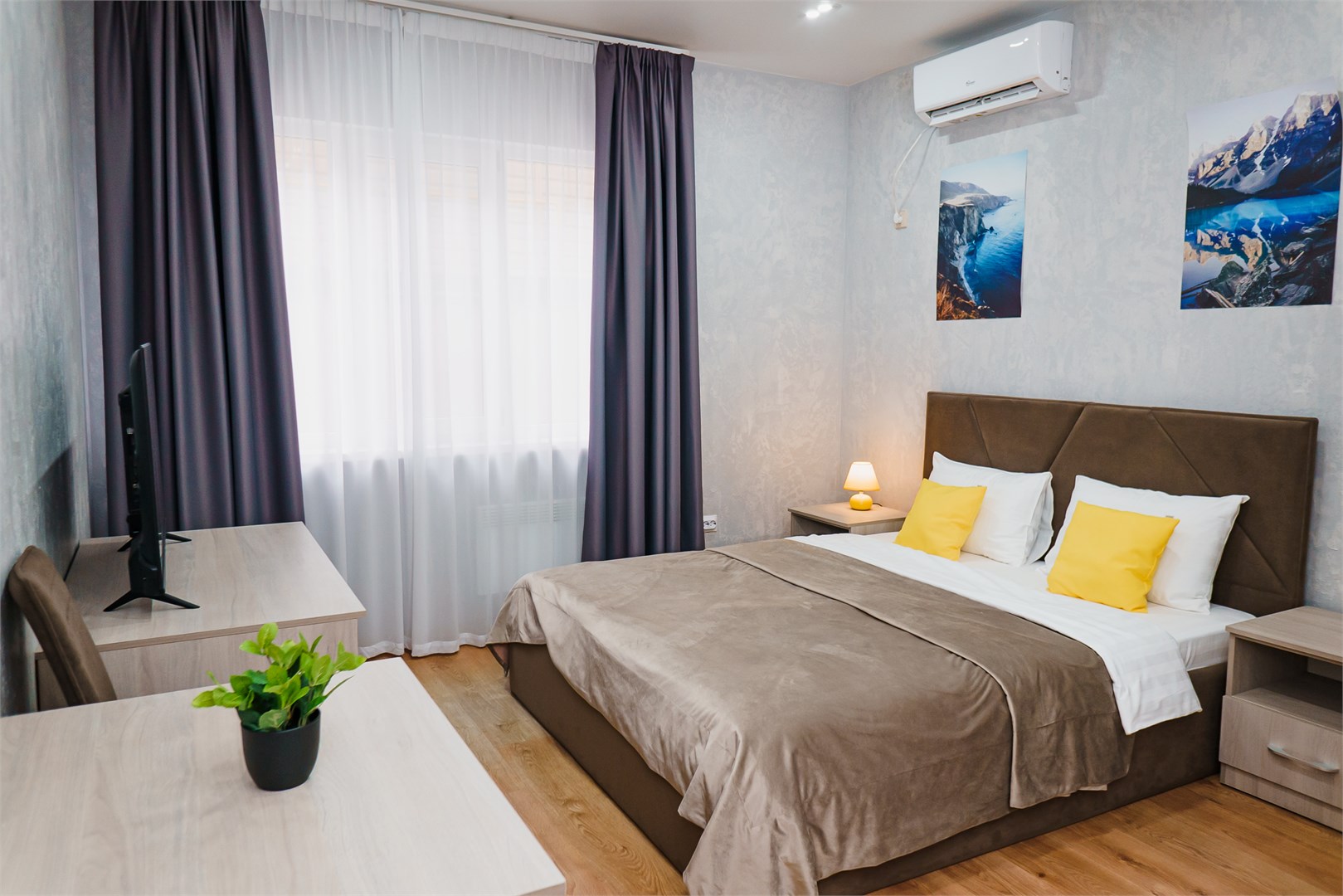 Номера оснащены современной мебелью, кондиционером, холодильником, ТВ. В каждом номере имеется собственный санузел с душем. Для каждого гостя мы предоставляем комплект полотенец, косметические наборы для душа, одноразовые тапочки. В номерах могут комфортно размещаться, самым маленьким нашим гостям мы готовы предоставить кровати-манежи для комфортного сна.