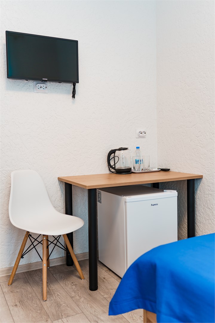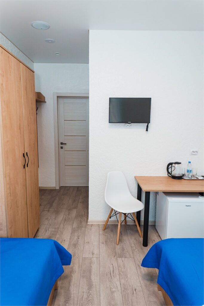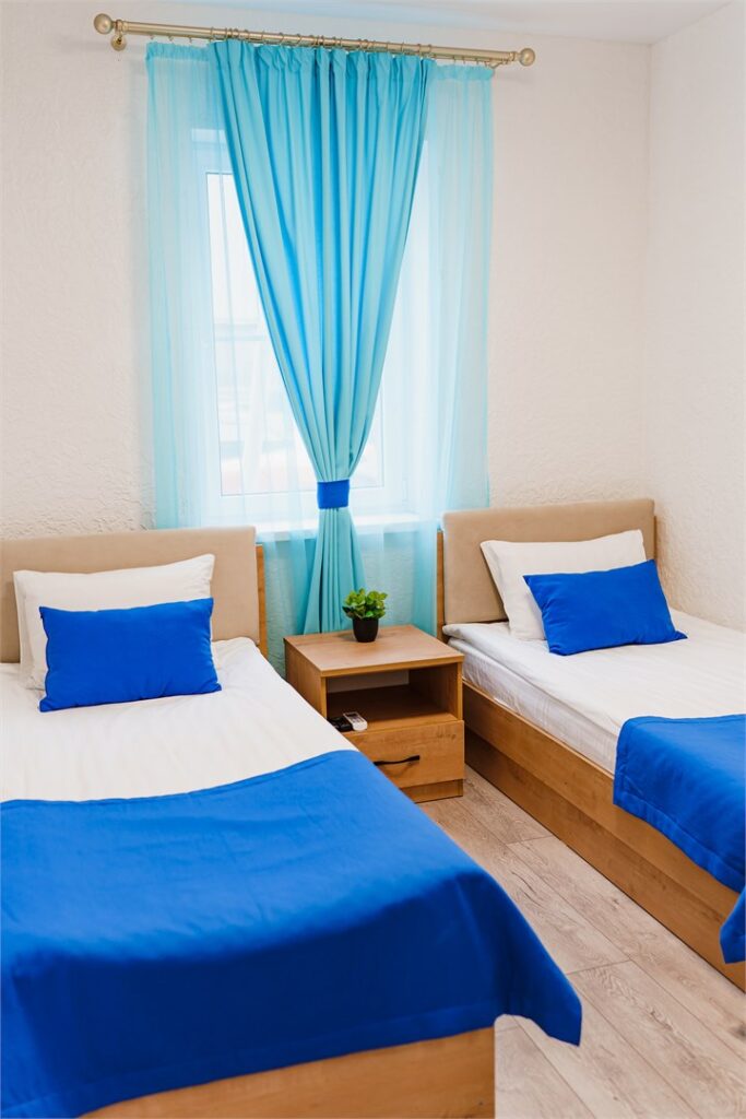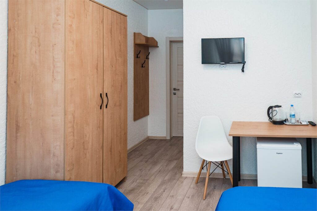 Номера оснащены современной мебелью, кондиционером, холодильником, ТВ. В каждом номере имеется собственный санузел с душем. Для каждого гостя мы предоставляем комплект полотенец, косметические наборы для душа, одноразовые тапочки. В номерах могут комфортно размещаться, самым маленьким нашим гостям мы готовы предоставить кровати-манежи для комфортного сна.