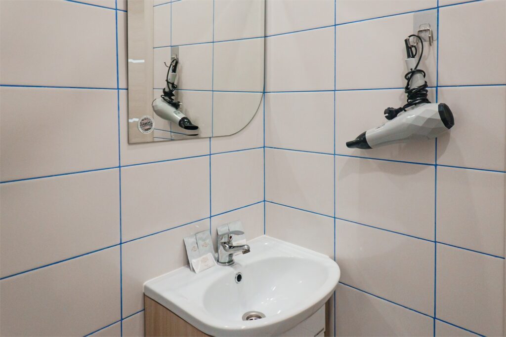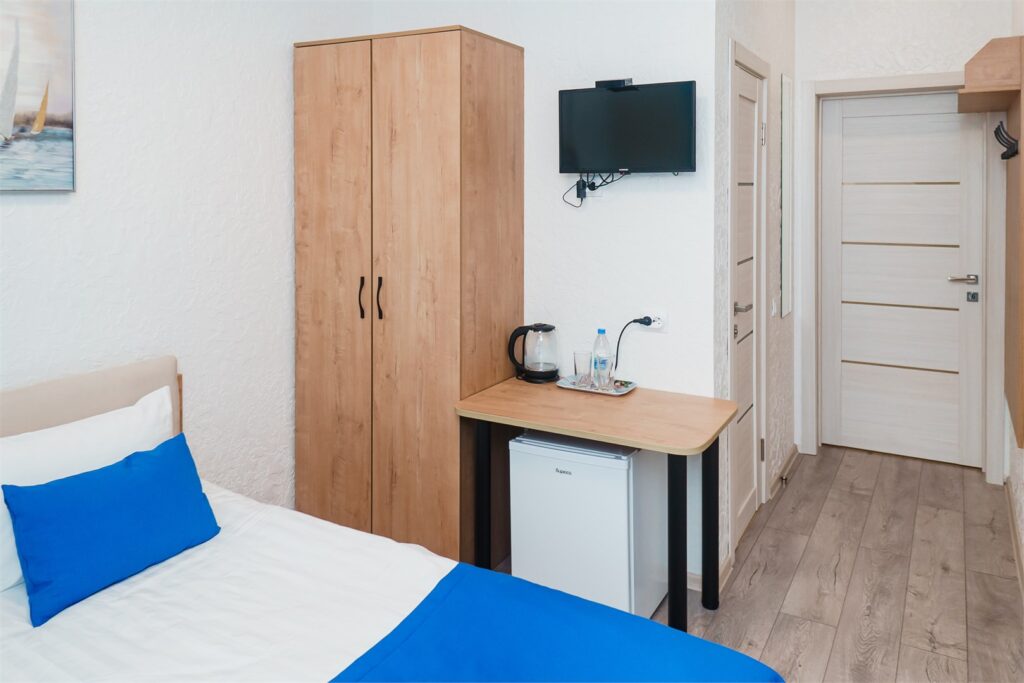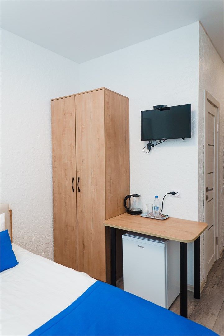 Номера оснащены современной мебелью, кондиционером, холодильником, ТВ. В каждом номере имеется собственный санузел с душем. Для каждого гостя мы предоставляем комплект полотенец, косметические наборы для душа, одноразовые тапочки. В номерах могут комфортно размещаться, самым маленьким нашим гостям мы готовы предоставить кровати-манежи для комфортного сна.